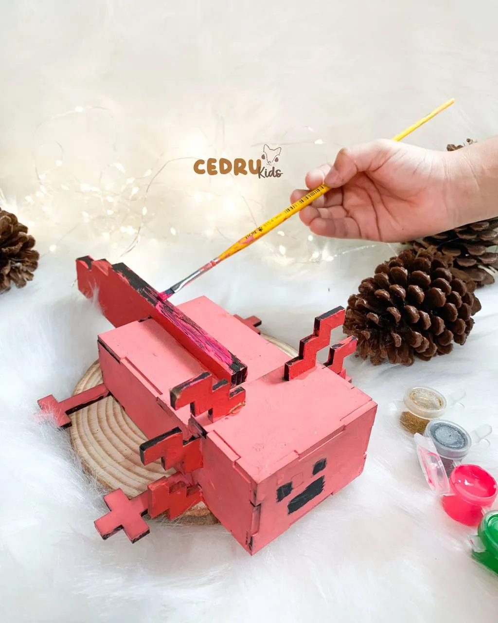 Encante com o <strong>Axolote Minecraft em MDF 3mm</strong>, um item divertido e artesanal para presentear, decorar festas, usar como lembrancinha ou atividade criativa infantil. \n \nProduzido em MDF cru com corte a laser, o axolote chega desmontado e pode ser montado facilmente. Além disso, é perfeito para pintar e personalizar, estimulando a imaginação e a coordenação motora. \n<h3>Tamanhos:</h3> \n<ul> \n <li><strong>Comprimento total (com rabo):</strong> 20 cm</li> \n <li><strong>Corpo:</strong> 12 cm</li> \n <li><strong>Largura do corpo:</strong> 6,5 cm</li> \n <li><strong>Com braços:</strong> 15 cm</li> \n</ul> \n<h3>Benefícios:</h3> \n<ul> \n <li><span dir="auto" style="vertical-align: inherit;"><span dir="auto" style="vertical-align: inherit;">Produto artesanal em MDF 3mm</span></span></li> \n <li>Fácil de montar e ideal para pintura</li> \n <li>Perfeito como lembrancinha de festa infantil</li> \n <li>Presente criativo para fãs de Minecraft e cultura geek</li> \n</ul> \nUm produto único que une diversão, criatividade e estilo geek em uma peça artesanal. \n \n<em>Qualquer dúvida estamos à disposição via chat. \nCedru agradece</em>